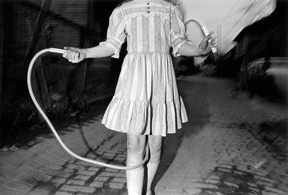 Cohen’s most iconic body of work, Grim Street, captures life in Wilkes-Barre from the 1960s through the 80s. Unlike the crowded avenues of New York or Tokyo, Wilkes-Barre offered a slower rhythm, porches, kids in the street, people escaping the summer heat. Cohen learned where and when life would appear, from bus stops to bridges where people hid from the rain. Each frame is a fragment of small-town America seen through the lens of surrealism, everyday bodies transformed into geometry, gestures into abstract forms.